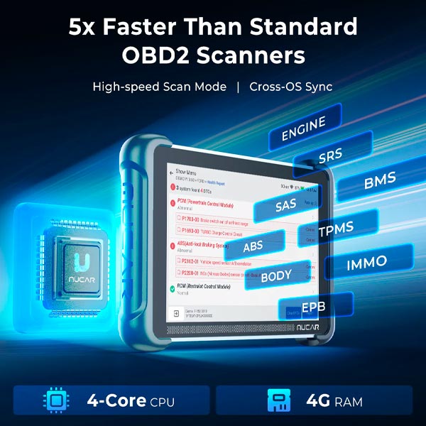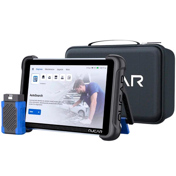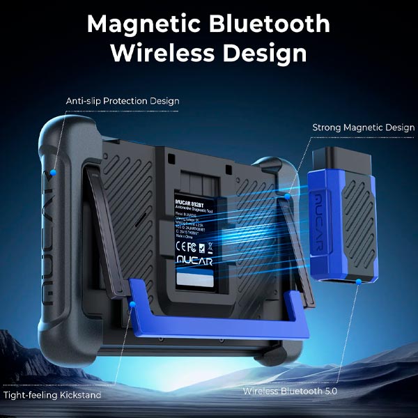 El Mucar 892BT viene con una tablet Android de 8 pulgadas, 64GB de memoria de almacenamiento, 4GB de RAM, actualizaciones gratuitas de por vida y directas a través de Wi-Fi. Posee un soporte magnetico trasero para fijar la interfaz bluetooth del escáner.